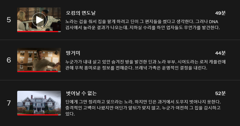 그러면서 부동산 중개인이자 노라의 친구인 캐런, 보안업체 다코타, 이웃집에 사는 모와 남편, 경찰서장, 이웃집 남매, 존 등 딘의 가족과 그의 집에 대해 너무나 관심이 많은 주변 인물들과의 의심과 갈등으로 7부작이 이어진다.